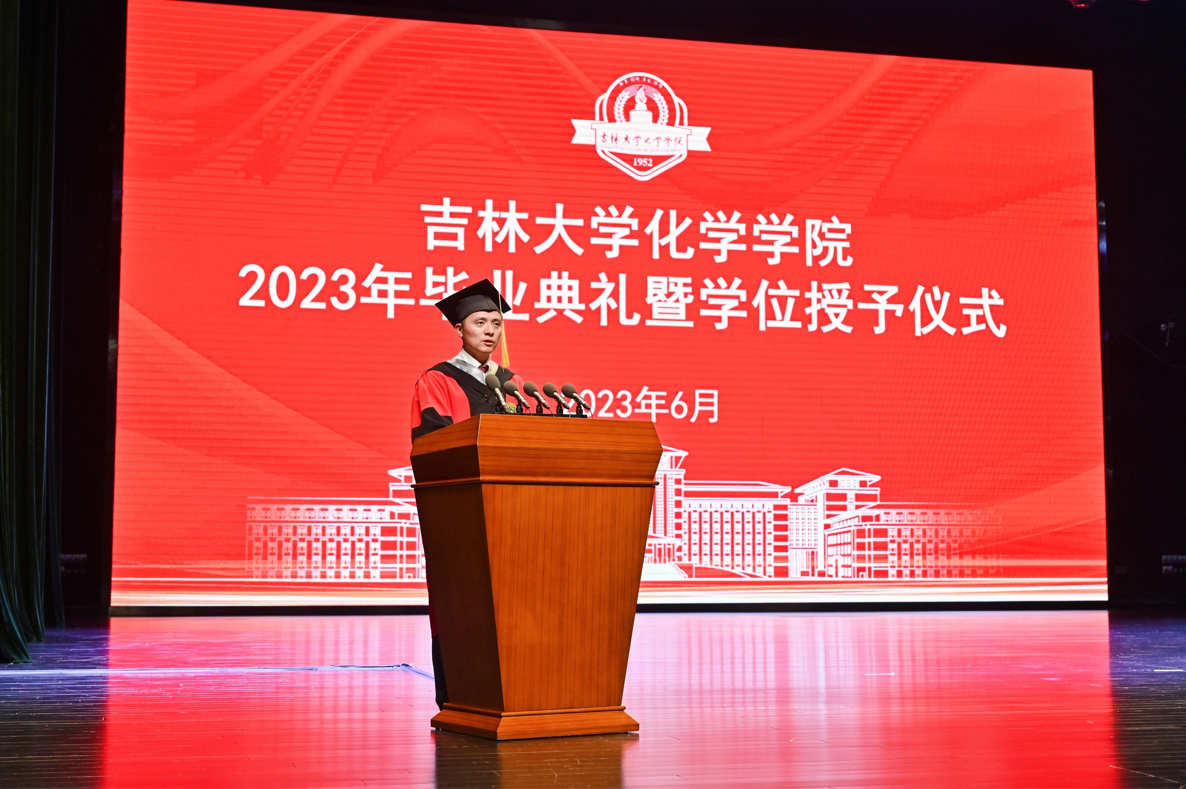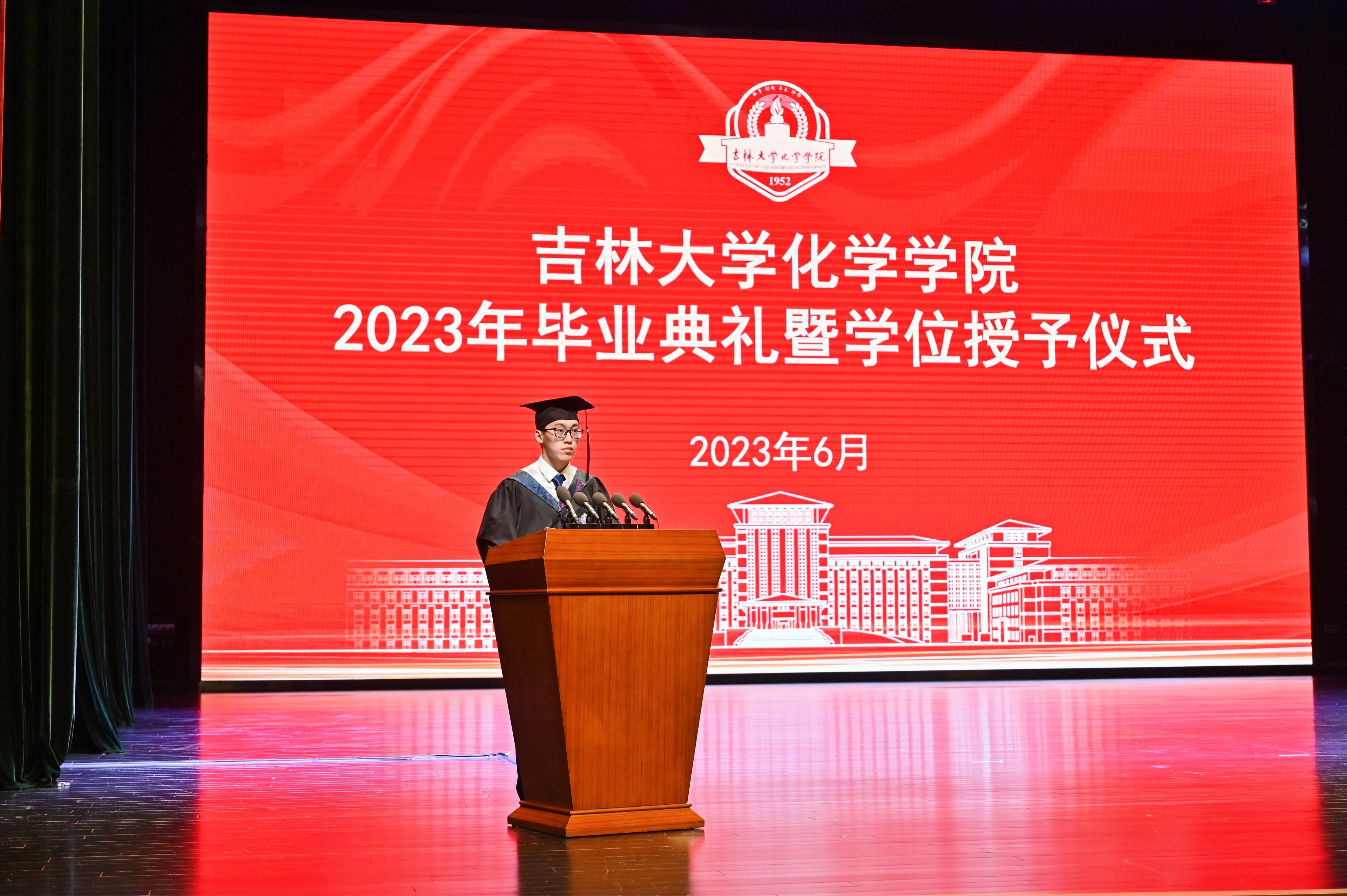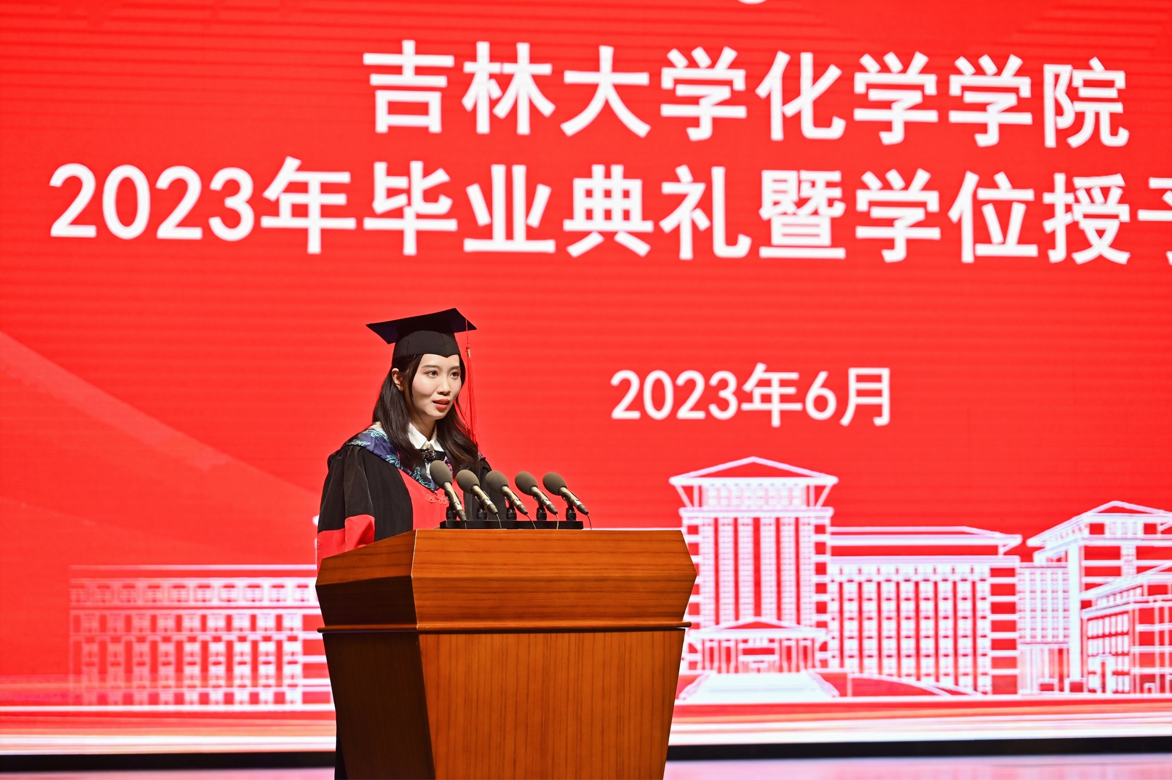 2023届毕业研究生代表、吉林大学2023届优秀毕业研究生迟茜文发言中深情回忆了在学校求学的美好时光,深深表达了对母校师生的恋恋不舍。她表示,吉大化学是一本书,既博大又包容,既严谨又谦和。吉大化学是一座城,这里永远住着怀揣梦想的人,每一个在这里生活过的人都用自己的时光温暖着她的岁月,都用自己的实际行动守卫着她的荣耀和尊严。她代表全体毕业生为学院送上了最真挚的祝福。