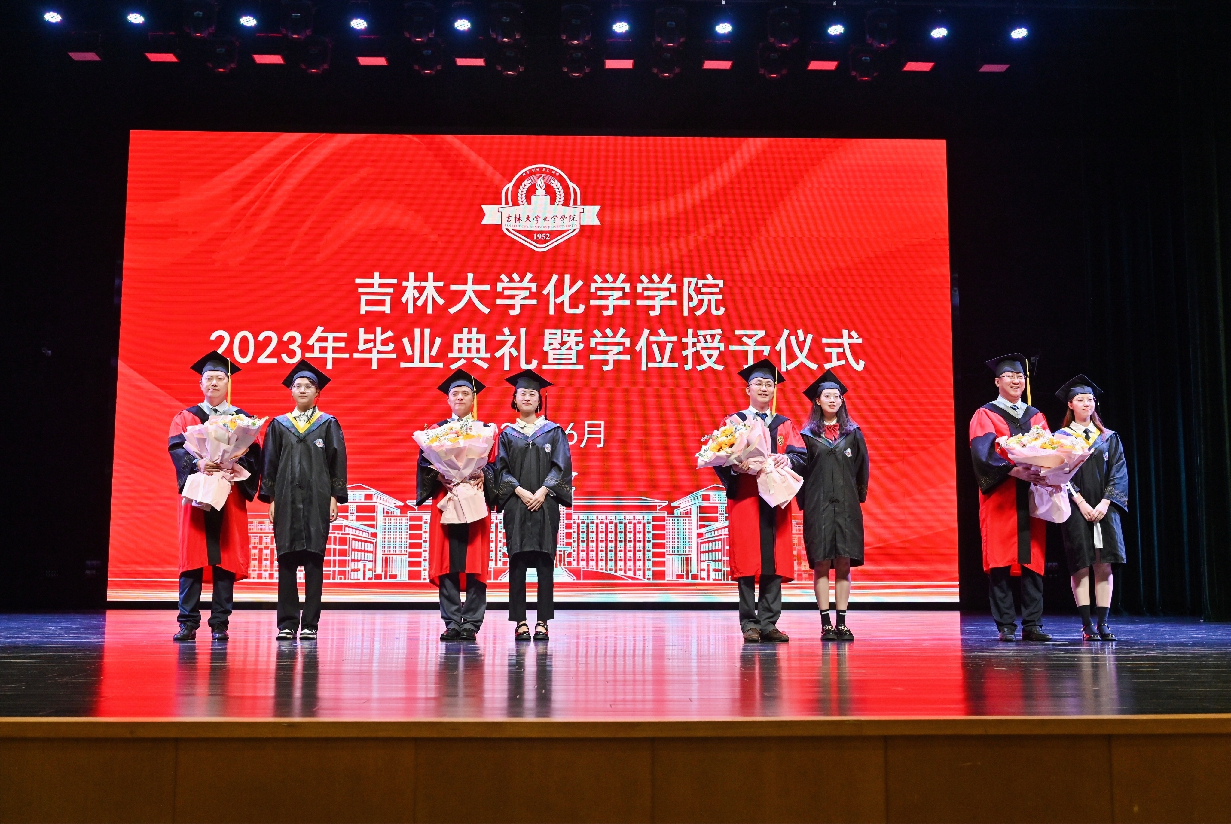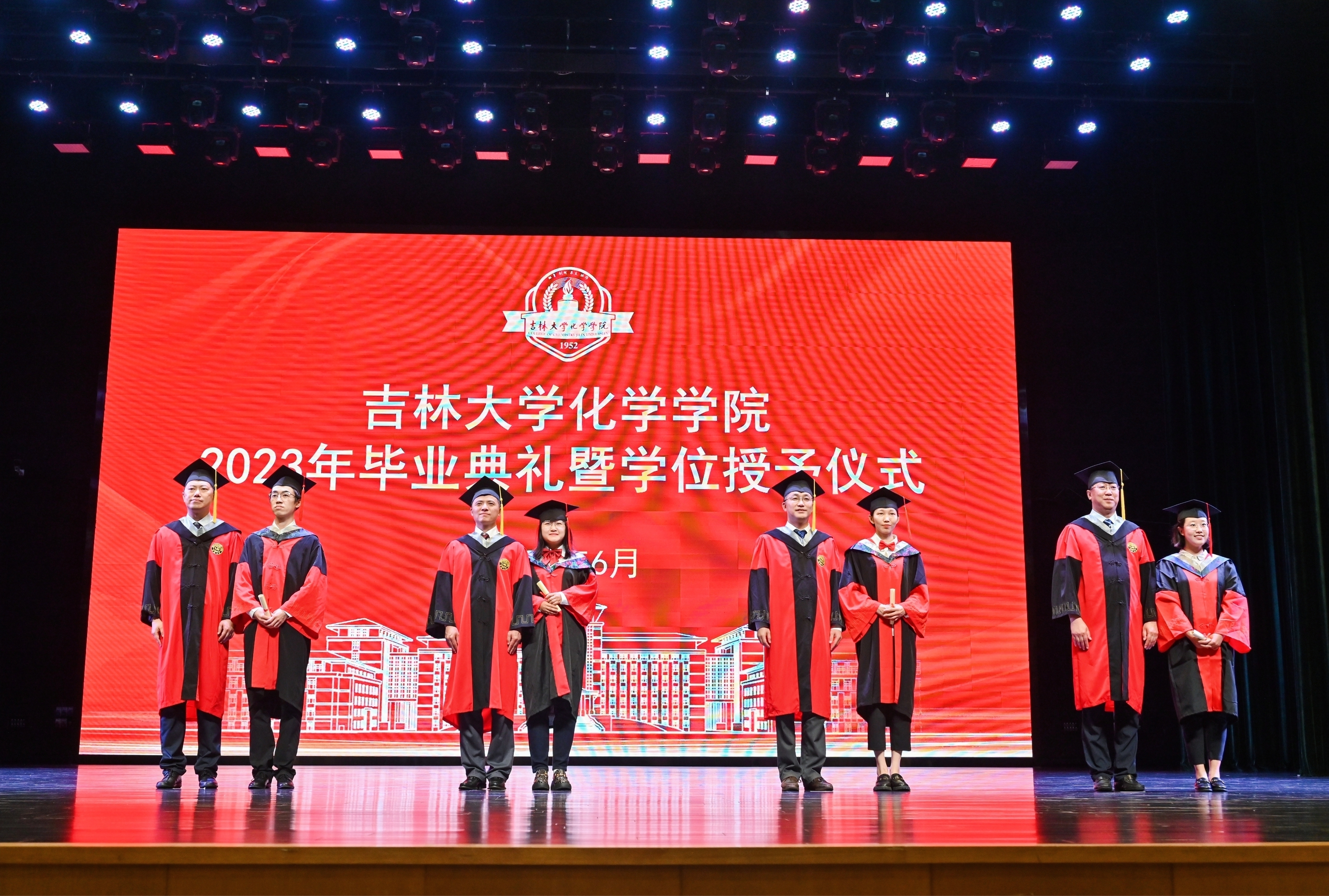 在学位授予仪式环节,副院长李乙宣读《吉林大学学位评定委员会授予硕士、博士学位的决定》、副院长郭玉鹏宣读《吉林大学学位评定委员会授予学士学位的决定》,主礼教授吕中元、郭玉鹏、张海博、李乙为获得博士学位、硕士学位、学士学位的毕业生拨动流苏、授予学位。