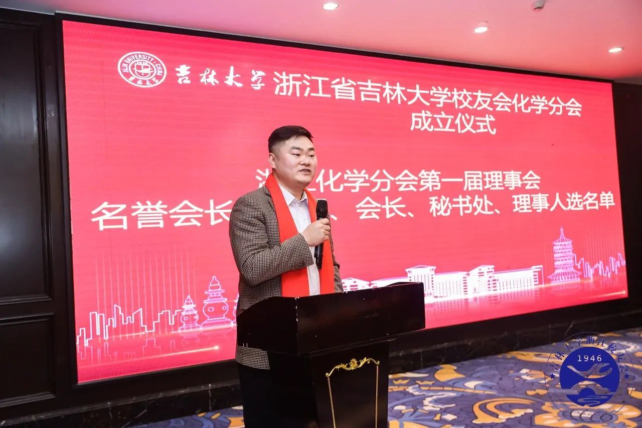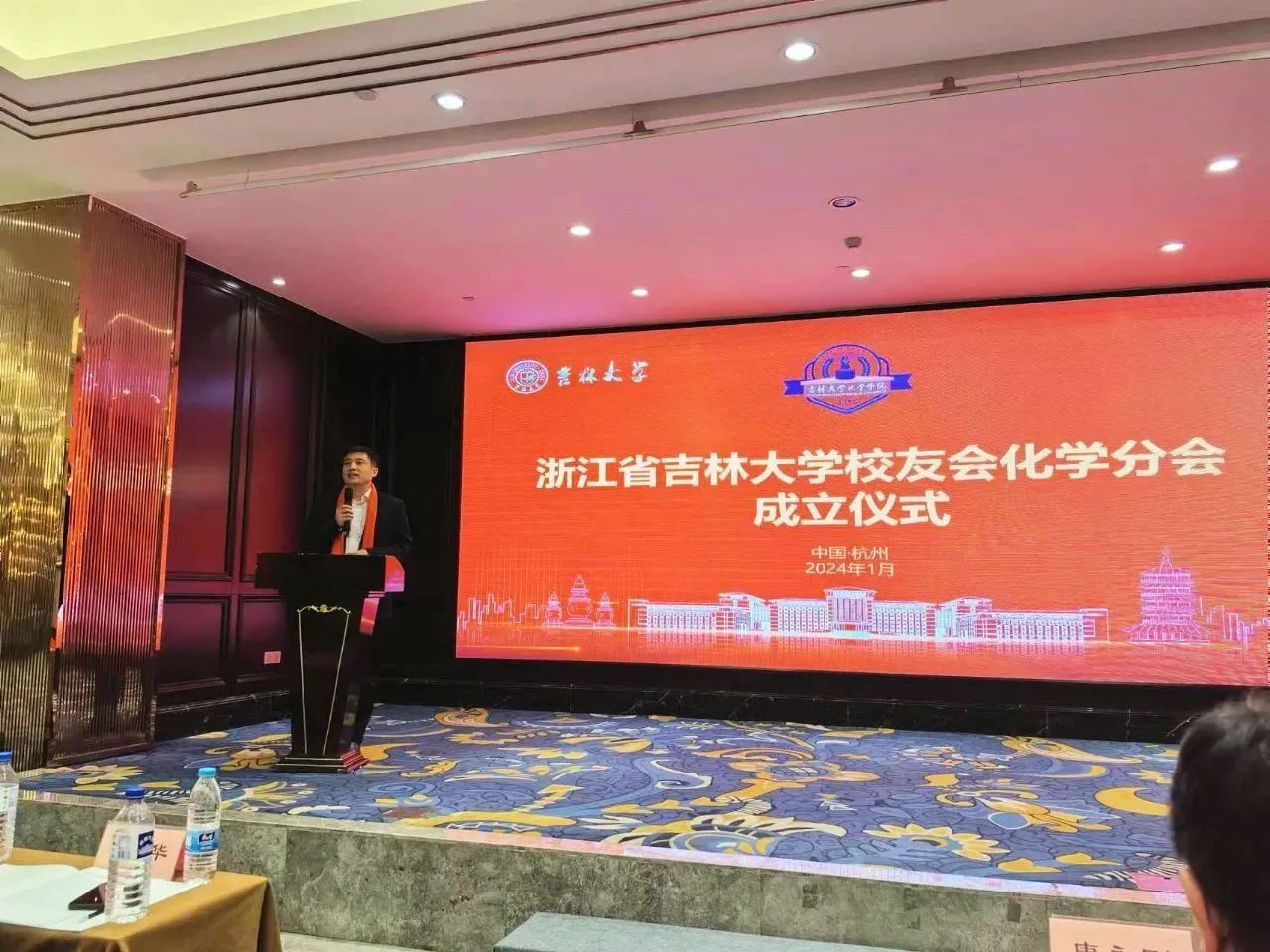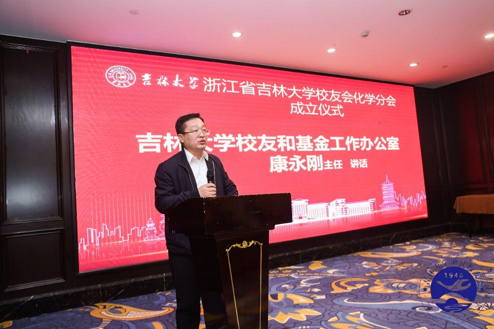 吉林大学校友和基金工作办公室主任、校友总会秘书长康永刚代表母校向浙江省吉林大学校友会多年来对母校的关注和支持表示感谢,向校友们在各行各业取得的成绩表示祝贺,并对浙江省吉林大学校友会化学分会的未来致以热烈期盼。他希望化学分会积极为化学学科校友打造交流与合作的平台,同时加强与各校友分会的互通有无,为母校发展和浙江省地方经济建设做出新的贡献。