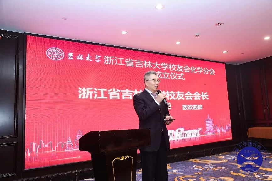 成立大会在庄严的国歌声中拉开序幕,浙江省吉林大学校友会会长姜丛华向母校各位领导、老师及参会嘉宾的莅临表示热烈欢迎,对广大校友的热心参与和积极支持表示感谢。他深情回忆了在母校的学习经历,勉励化学校友们以化学分会成立为契机,团结协作创新共赢,积极助力母校发展,建设好在浙化学校友的精神家园,并祝愿吉林大学化学学科早日迈进世界一流学科前列。