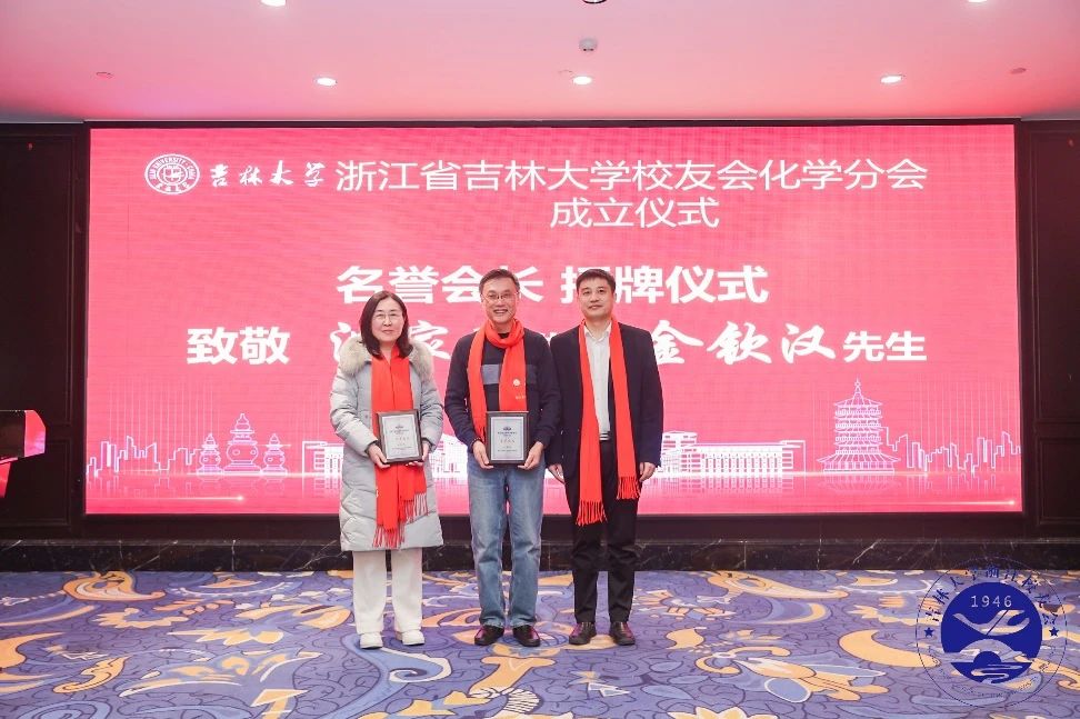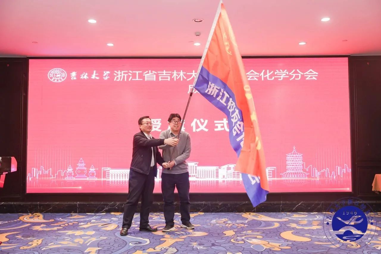 吉林大学校友和基金工作办公室副主任、校友总会副秘书长许诺宣读了《关于同意筹建浙江省吉林大学校友会化学分会的批复》,浙江省吉林大学校友会化学分会筹备组负责人范海涛校友向大会汇报了校友会的筹备情况,并回顾了吉大化学学科的发展历程,表达了对母校的感激之情。随后,吉林大学校友和基金工作办公室主任、校友总会秘书长康永刚向浙江省吉林大学校友会化学分会副会长郑水龙授旗。