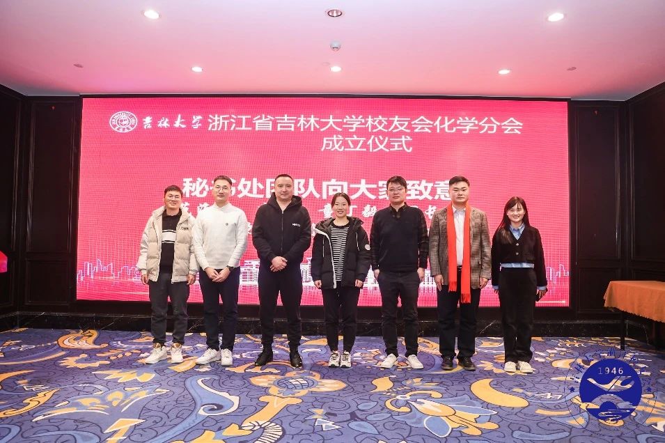 党委副书记李勇,校友和基金工作办公室副主任、校友总会副秘书长许诺,浙江省吉林大学校友会会长姜丛华,上海、无锡、常州等吉林大学兄弟校友会代表,浙江省北京大学校友会会长陈云峰、辽宁大学浙江校友会会长李欣等在浙知名高校校友会会长,高长有、高明远、牟颖、竺亚斌、苏彬、郑水龙、应子英、商铁存等40余位在浙吉大化学校友齐聚一堂,共同见证成立大会。全球各地吉大化学校友纷纷发来贺信贺电,83级化学校友、杭州师范大学刘俊秋教授,85级化学校友、华南师范大学顾凤龙教授,吉林大学广州校友会、常州校友会、上海校友会化学分会、深圳校友会化学分会、北京校友会化学分会录制视频,向浙江省吉林大学校友会化学分会的成立表示热烈祝贺。