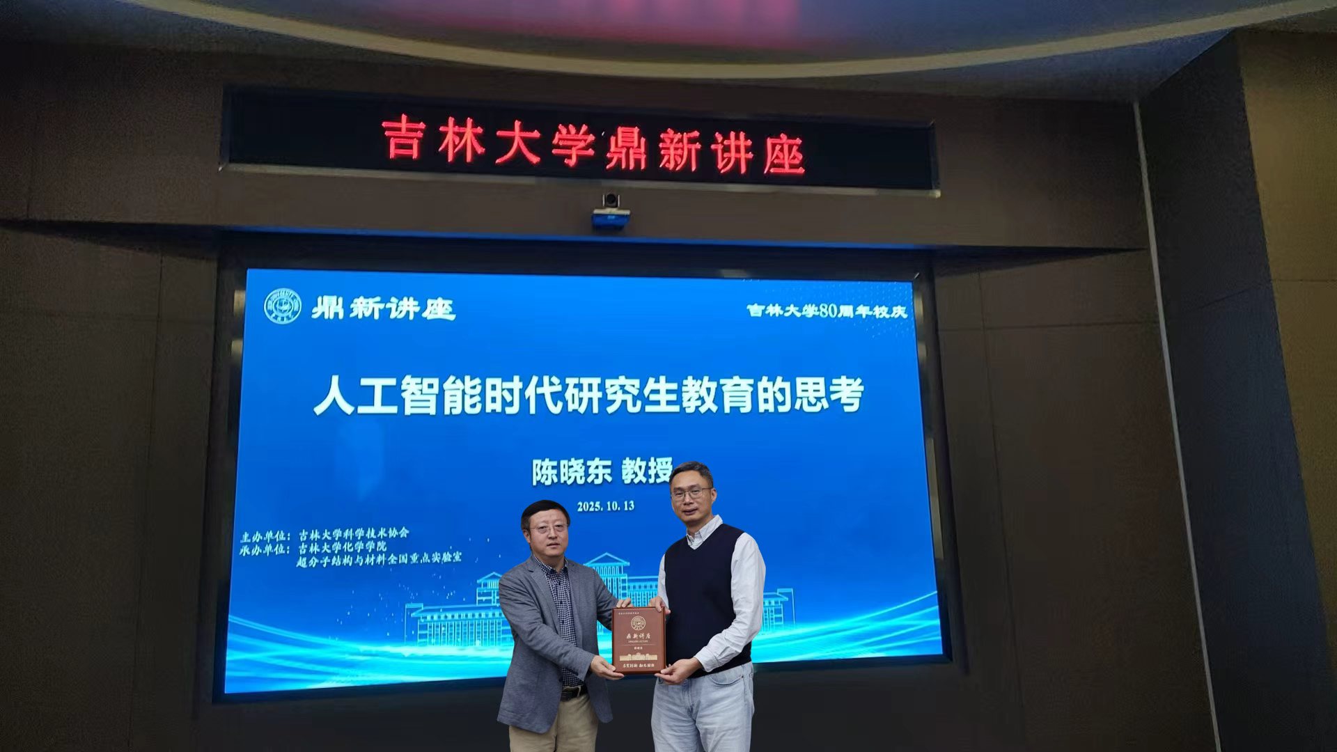 10月13日,英国皇家学会院士、德国国家科学院院士、新加坡国家科学院院士、新加坡工程院院士、新加坡南洋理工大学陈晓东教授应邀做客吉林大学鼎新讲座,并以“人工智能时代研究生教育的思考”为题作专题报告。超分子结构与材料全国重点实验室副主任张文科主持讲座并为陈晓东颁发“鼎新讲座纪念牌”。