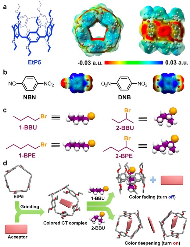 为解决以上问题,近日吉林大学杨英威课题组通过重建(开启)和破坏(关闭)乙基柱[5]芳烃(EtP5)和缺电子芳香客体(包括4-硝基苯甲腈(NBN)和1,4-二硝基苯(DNB))之间的CT相互作用构筑得到一类亚稳态的开关型汽致变色共晶材料。研究发现,无色的EtP5粉末可直接通过研磨的方法与NBN(无色)和DNB(棕色)在固相状态下相结合形成亚稳态的CT复合物(EtP5-NBN和EtP5-DNB)。由于分子间电荷转移相互作用的存在,EtP5-NBN和EtP5-DNB粉末分别呈现淡黄色和橙红色。有趣的是,当吸附1-溴丁烷(1-BBU)和1-溴戊烷(1-BPE)的蒸汽时,这些粉末中的CT相互作用会被破坏,并伴随颜色的褪去,而在暴露于2-溴丁烷(2-BBU)和2-溴戊烷(2-BPE)的蒸汽后,这些粉末的颜色会明显加深,整体呈现出开关式的汽致变色现象。单晶和粉末X射线衍射分析表明,颜色褪去和加深分别归因于1-溴代烷异构体的竞争性主客体结合,以及2-溴代烷异构体引发的固相分子运动(晶相重构)以形成高度有序的D-A结构,其中EtP5的动态分子间相互作用和选择性分子识别在决定组装体CT状态和所得晶相中分子的排列与堆积方面起着关键作用。