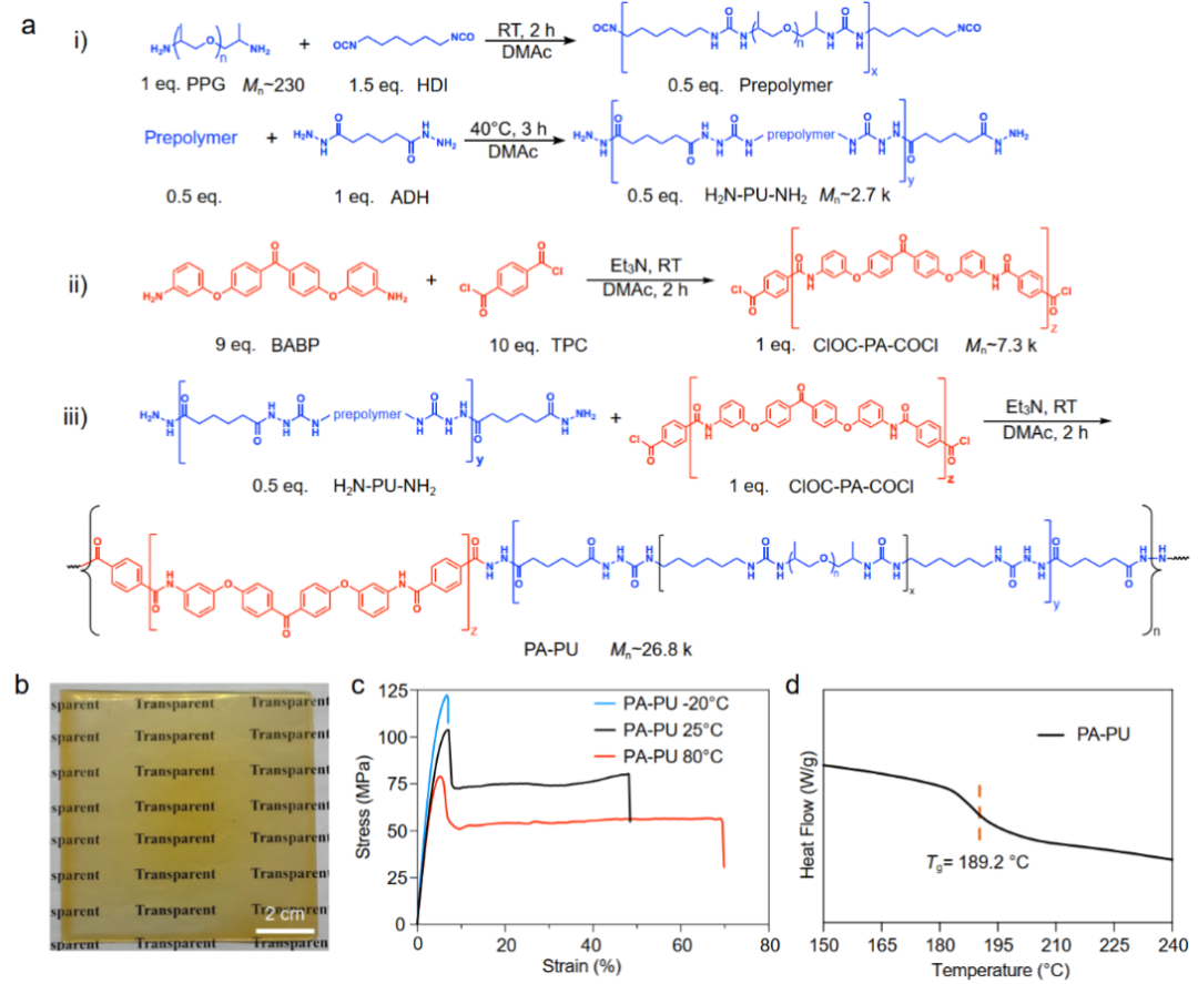PA-PU塑料由刚性聚酰胺链段与柔性聚脲链段共聚而成(图1a)。其中,酰氯封端的聚酰胺由双(4-(3-氨基苯氧基)苯基)甲酮与对苯二甲酰氯缩聚得到;氨基封端的聚脲则由氨基官能化聚丙二醇、六亚甲基二异氰酸酯和己二酰肼聚合制备。采用简便的溶液浇铸法即可制备出黄色透明的PA-PU塑料薄膜(图1b)。在室温下,PA-PU展现出超高的屈服强度(103.7 MPa)和高的杨氏模量(2.5 GPa);屈服后出现典型的冷拉行为,断裂伸长率达到48.5%,韧性高达36.1 MJ/m³(图1c)。在80 °C下,PA-PU仍保持79.0 MPa的高屈服强度;在-20 °C下,PA-PU的断裂强度进一步提升至122.5 MPa。DSC测试显示,PA-PU的玻璃化转变温度高达189.2 °C(图1d)。
