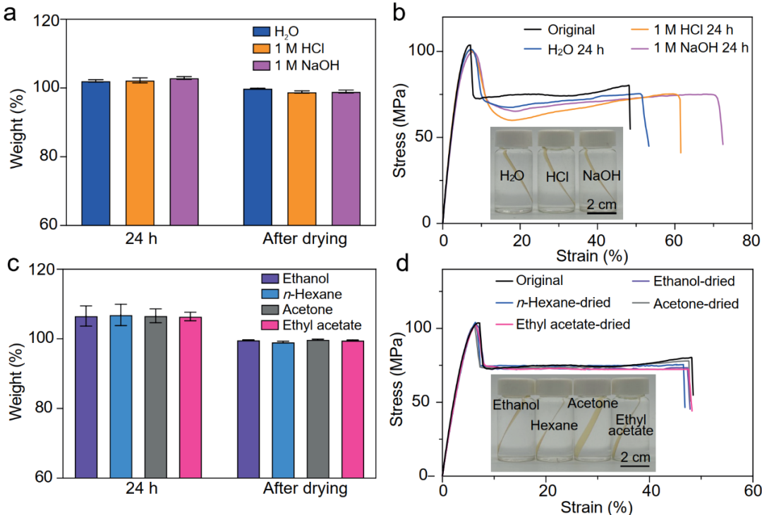 图3. PA-PU的化学稳定性。(a) PA-PU塑料在水、1 M HCl和1 M NaOH水溶液中浸泡24 h和干燥后的质量变化。(b) PA-PU塑料在不同水溶液中浸泡24 h后,未经干燥状态下的应力-应变曲线。(c) PA-PU塑料在乙醇、丙酮、正己烷和乙酸乙酯中浸泡24 h后经过干燥后的质量变化。(d) PA-PU塑料在各种有机溶剂中浸泡24 h,经60 °C干燥后的应力-应变曲线。
