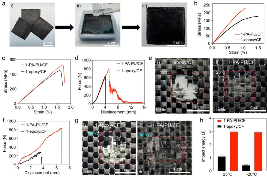 图4. PA-PU/CF复合材料的力学与抗冲击性能。(a) PA-PU/CF的制备过程图。(b, c) PA-PU/CF在弯曲(b)和拉伸模式(c)下的应力-应变曲线。(d, e)1-PA-PU/CF和1-epoxy/CF在室温冲击测试中的力-位移曲线(d)以及冲击断裂后的实物照片(e)。(f, g)1-PA-PU/CF and 1-epoxy/CF在-20 °C冲击测试中的力-位移曲线(f)以及冲击断裂后的实物照片(g)。(h) 1-PA-PU/CF和1-epoxy/CF在室温及-20 °C下的冲击能。