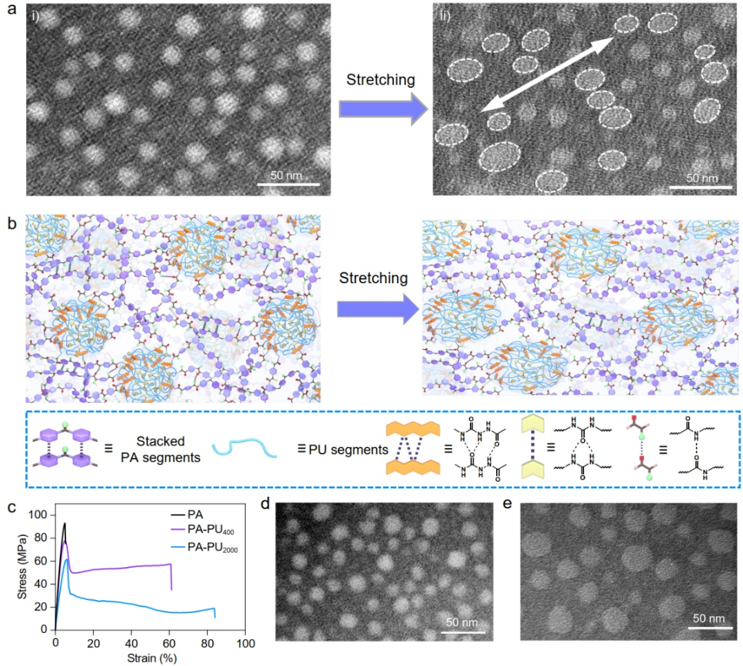图2. PA-PU塑料超高强度、模量和韧性的机理研究。(a)原始(i)和拉伸后(ii)的PA-PU塑料的TEM图像。(b) PA-PU塑料在拉伸下的能量耗散示意图。(c) PA, PA-PU400和PA-PU2000塑料的应力-应变曲线。(d, e) PA-PU400(d)和PA-PU2000(e)的TEM图像。PA-PU400和PA-PU2000塑料的下角标表示PU链段中氨基官能化聚丙二醇的分子量。