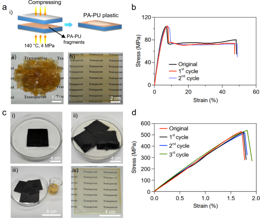 图5. PA-PU塑料的再加工及PA-PU/CF复合材料的回收利用。(a) PA-PU塑料的再加工过程图。(b)原始及两次再加工后PA-PU塑料的应力-应变曲线。(c) PA-PU/CF复合材料的回收过程图。(d)原始及三次回收后PA-PU/CF复合材料的应力-应变曲线。