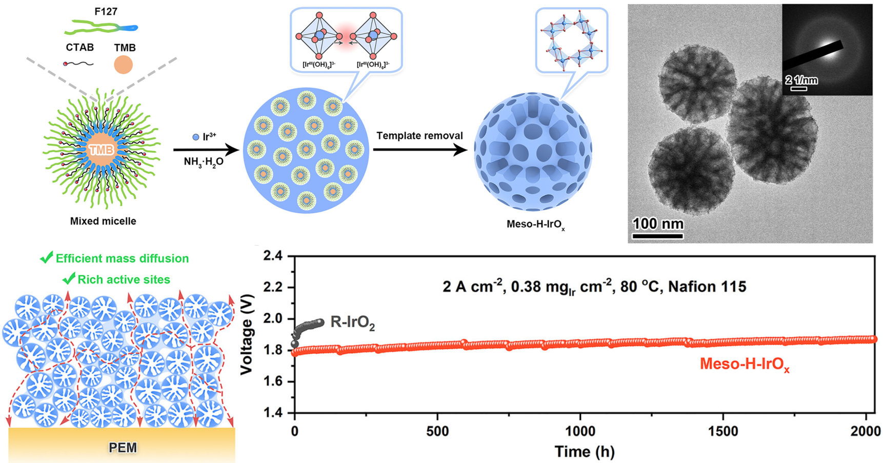 针对非晶IrOx在酸性析氧反应中普遍存在的高活性-低稳定性难题,邹晓新教授团队近期提出了一种双尺度结构工程策略。通过双表面活性剂导向的合成方法,并结合孔扩增剂,制备出具有hollandite型短程有序结构的介孔IrOx催化剂,其平均孔径约10 nm,比表面积达55 m²/g,实现了原子尺度与介观尺度的协同优化。在原子尺度上,hollandite结构通过可逆且可修复的晶格氧参与机制,使Ir位点可在六配位初始态与低配位活性态之间动态循环,抑制了不可逆的Ir溶解,打破了传统非晶IrOx的稳定性瓶颈。在介观尺度上,均一的介孔通道提高了活性位点可及性,增强了反应过程中的水/气传输,从而降低了传质过电位。在电解槽测试中,该催化剂在1.75 V槽压下即可实现2 A/cm2电流密度,并稳定运行超过2000小时。