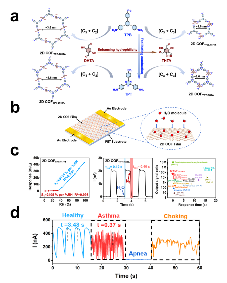 实时、精准地监测人体生理信号是未来物联网医疗与可穿戴健康设备的核心需求。其中,呼吸监测作为评估呼吸系统功能、辅助疾病早期诊断及运动健康管理的关键指标,对传感材料的灵敏度、响应速度及稳定性提出了极高要求。共价有机框架材料(COFs)凭借其高比表面积、可调的孔道结构及卓越的分子可设计性,成为构筑高性能湿度传感平台的理想候选。然而,如何从分子层面精准调控其电子结构、亲水性与纳米孔道,并建立其与宏观传感性能之间的内在关联,一直是该领域迈向实际应用的关键瓶颈。
