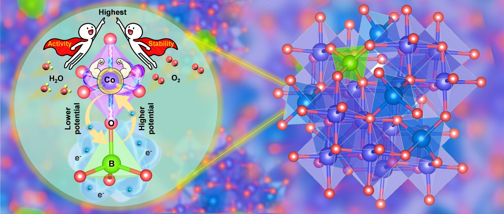 针对上述挑战,吉林大学黄科科教授团队设计了一种新型催化剂,他们巧妙地将“类金属”硼原子选择性地占据Co3O4中的四面体钴位点。这不仅在合成方面实现了一项重要突破,更关键的是,由此精准构筑的[BO4]结构单元促进了电子向八面体活性位点离域,赋予了催化剂一种独特的“自适应调控”能力。具体而言,该研究以具有强碱性和强氧化性的水氧化反应为催化模型,结合一系列原位表征技术,研究发现:在较低的氧化电位下,[BO4]单元能够对该外部刺激作出积极响应,推动活性八面体钴位点向有利的活化状态转变,从而显著提升本征活性。而当电位升高时,[BO4]单元则展现出另一种调控方式,反向调节电子流向,有效抑制活性位点的过度氧化,进而增强催化剂的耐久性。这项工作揭示了通过精准结构调控实现自适应电子转移的内在机制,为高性能催化体系的设计提供了全新思路。